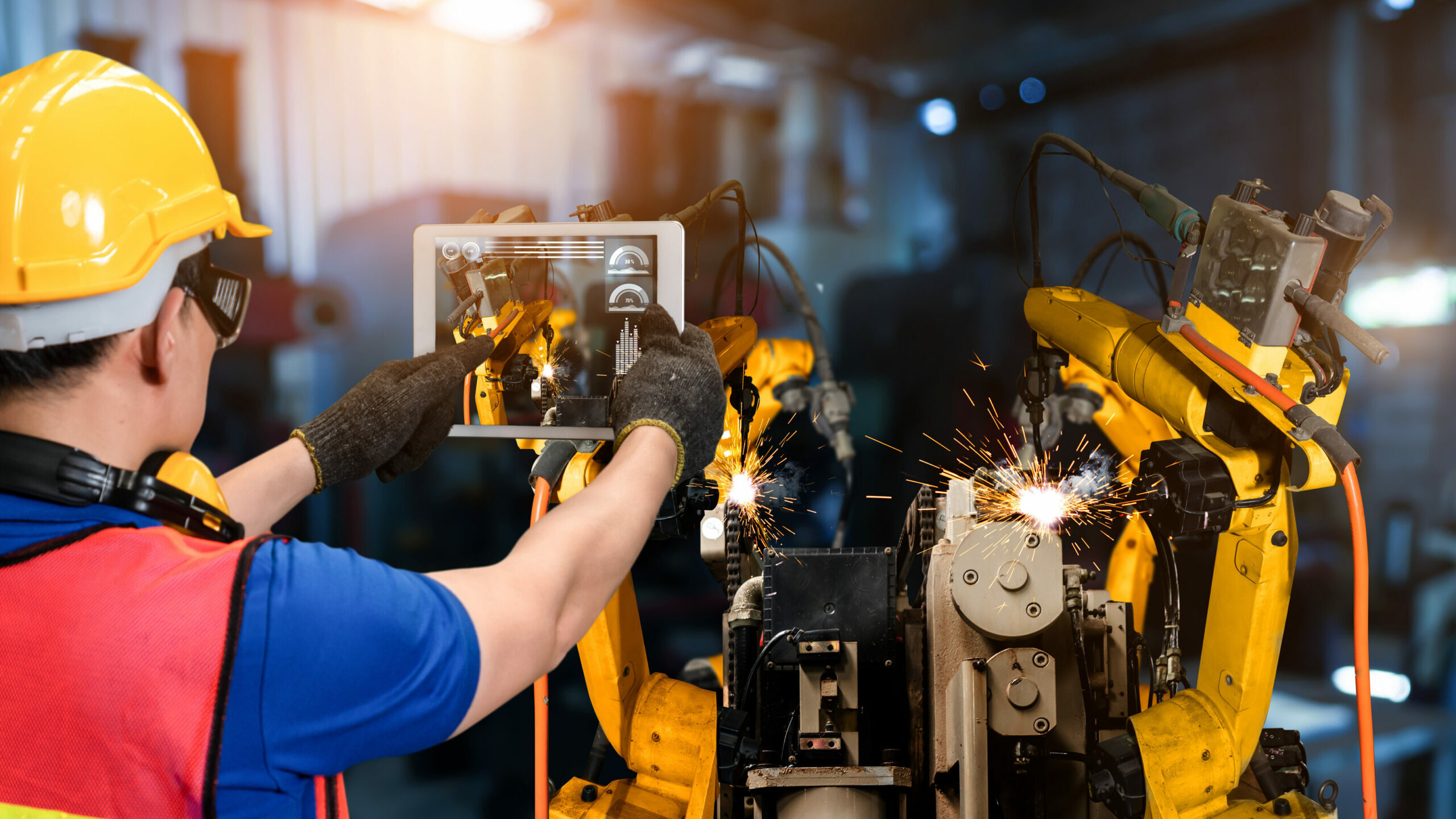 Smart industry robot arms for digital factory production technology showing automation manufacturing process of the Industry 4.0 or 4th industrial revolution and IOT software to control operation .