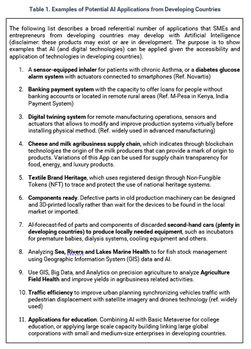 AI and digital transformation are needed to provide solutions to climate and the environment, energy efficiency, food production, urban-rural disparities, and city management. In developing countries, firms must have access to know-how and data, as well as to basic sciences being developed in universities and research centers in the North. Based on UNIDO’s technical cooperation[15], Table 1 provides a list of applications that SMEs and entrepreneurs may potentially design in emerging markets. These applications do not require access to complex neural networks, basic science, and can use advanced sensors and actuators imported from elsewhere.